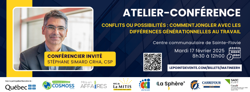 Le Comité emploi de La Mitis invite les entrepreneurs, gestionnaires d’équipe, responsables RH ou toute personne qui souhaite améliorer la cohésion, la communication et l’engagement au sein de son organisation, à participer à la matinée RH Conflits ou possibilités? Jongler avec les différentes générations au travail. L’activité aura lieu le mardi 17 février 2026 (remis au 19 février en cas de mauvais temps), de 8h à 12h, au centre communautaire de Sainte-Flavie (775 rte Flavie-Drapeau, Ste-Flavie).